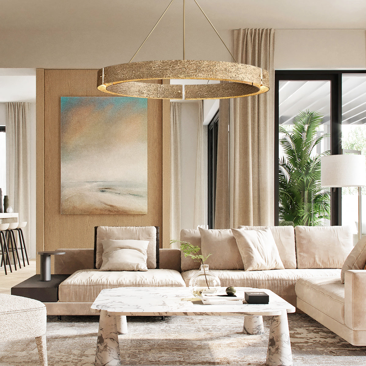 The focal point of the Vouvrey collection of modern sculptural lighting, solid brass is cast in hand-formed molds to achieve intricate, sensual textures that shape the minimalist geometry of the surface, and its chandelier glow is moody and atmospheric, showcasing the beauty of modern modern living rooms.