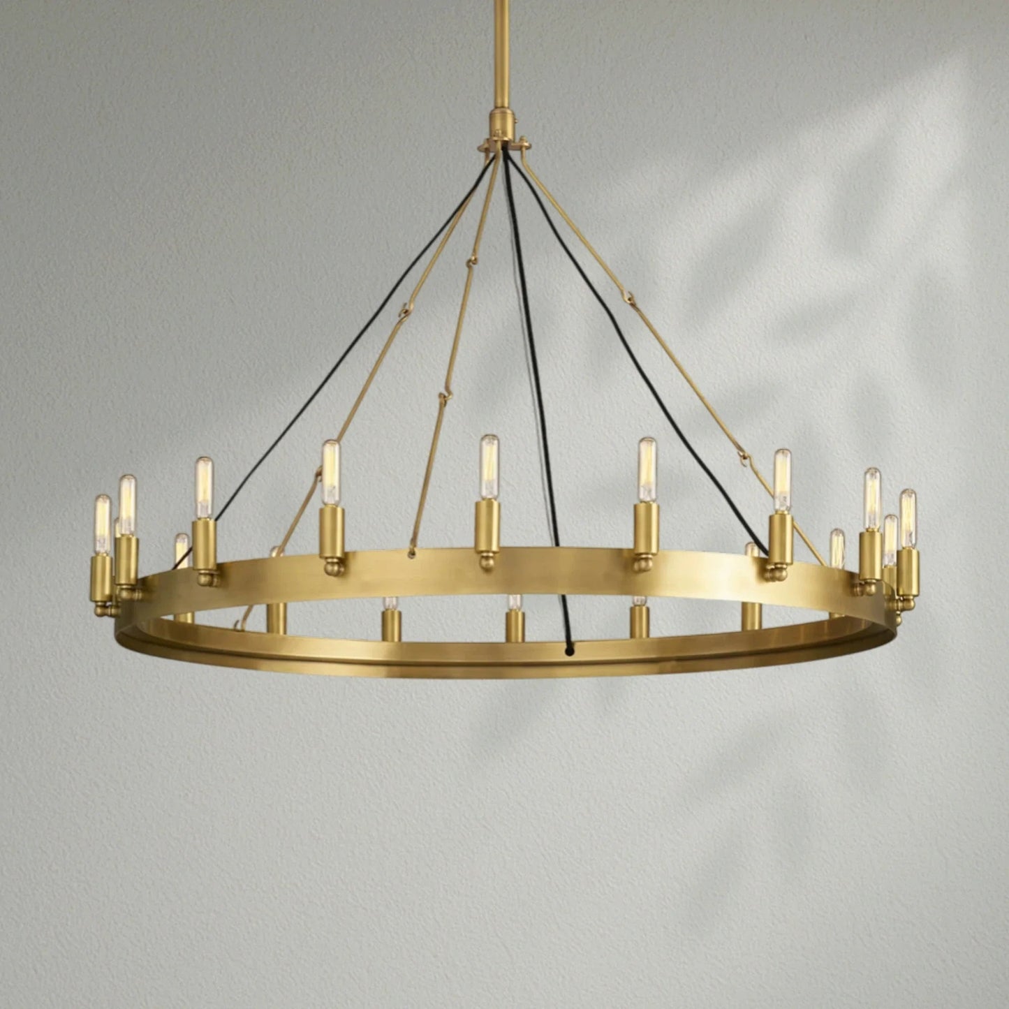 Rustic in style, simple in form and grandly sized, the chandelier Drawing inspiration from early 20th century industrial fixtures, it's built of stout angle iron. |