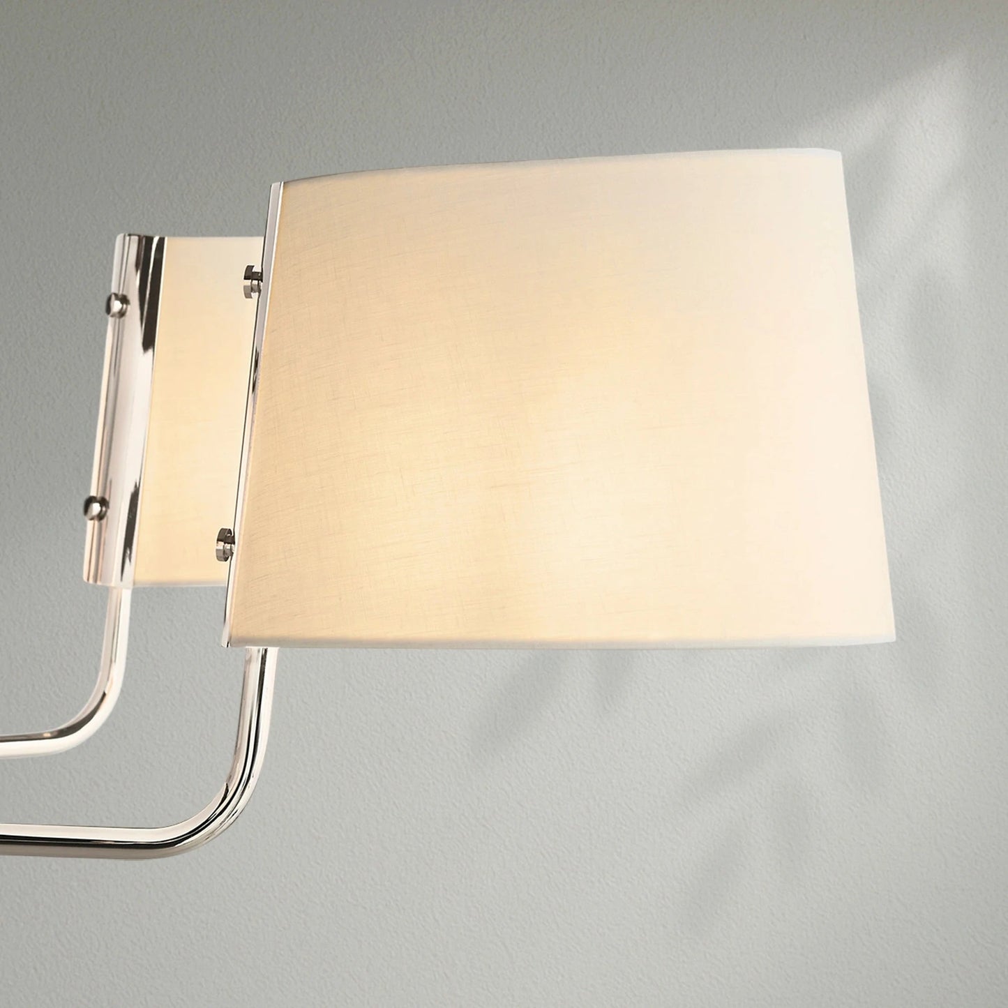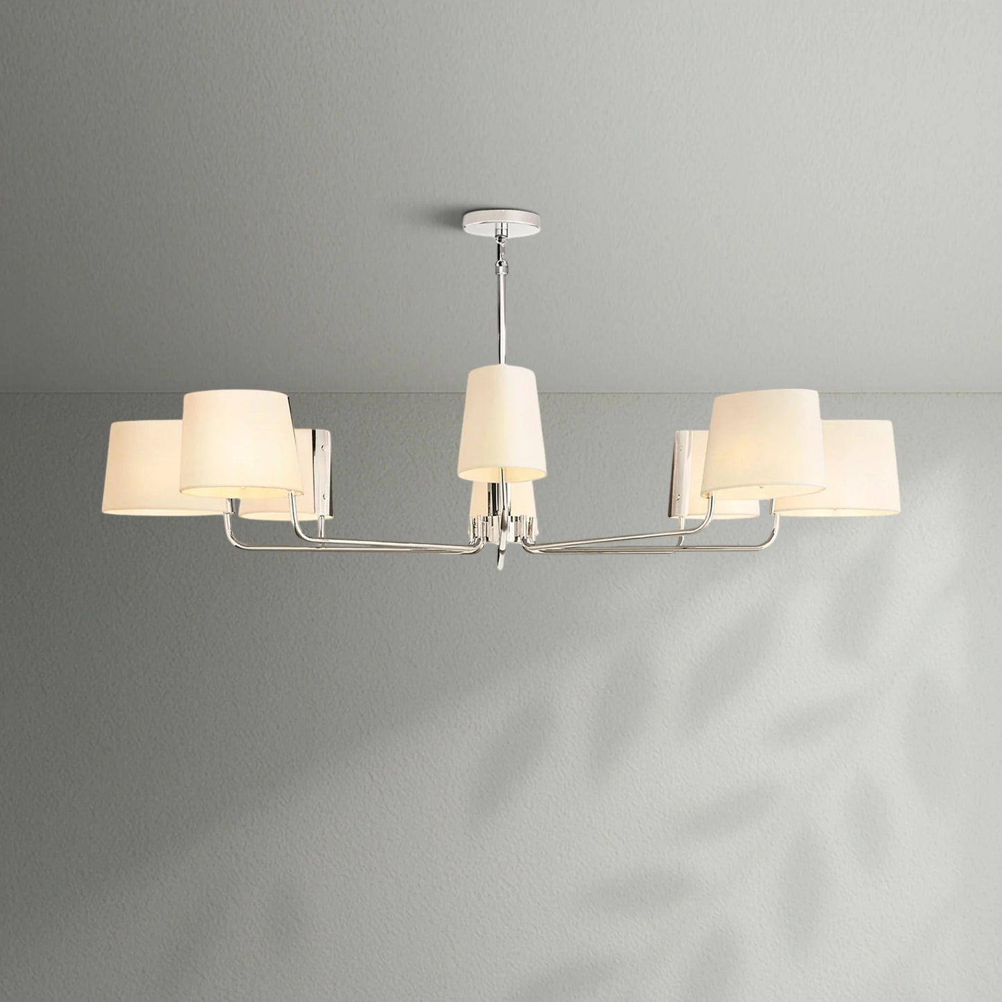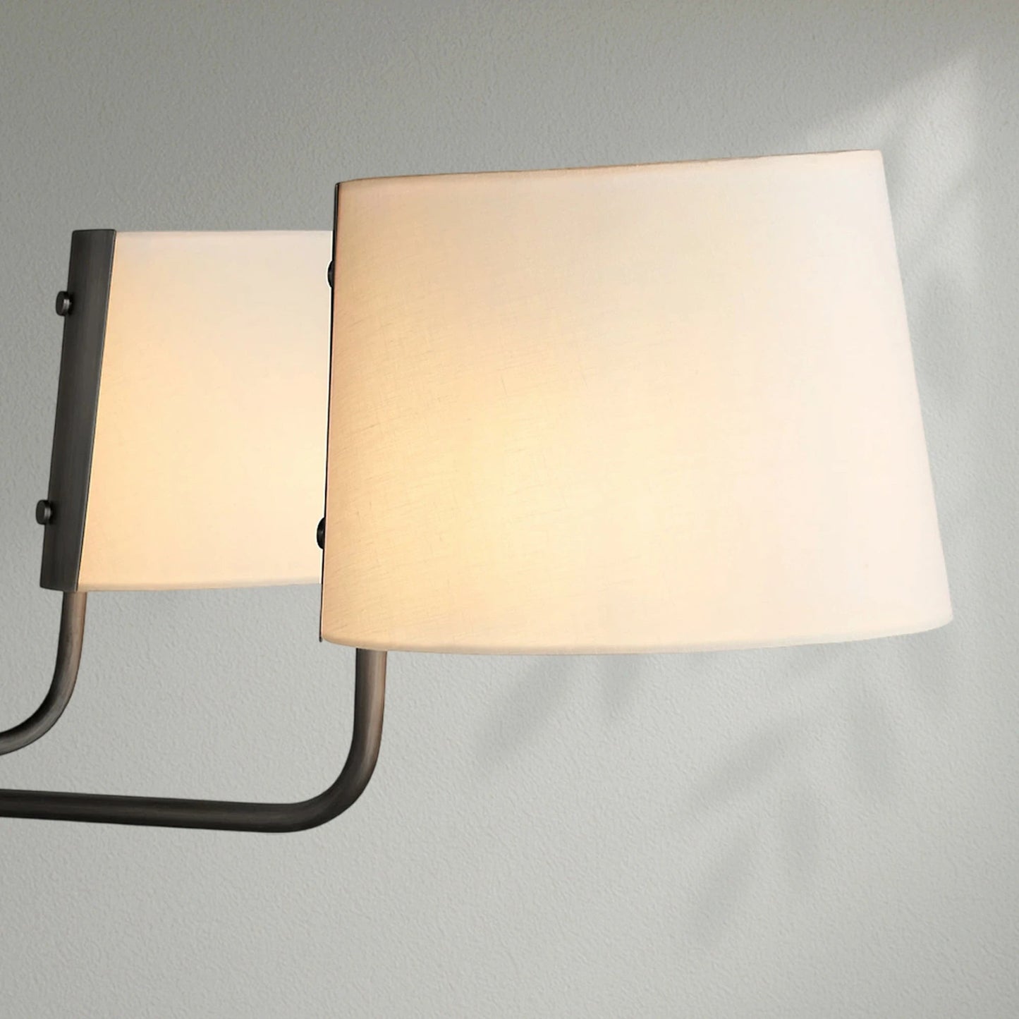 Designer looked to French designs of the 1940s and 50s for this lyrical collection, a minimalist meditation on form and function. Slender brass rods reminiscent of line drawings bend upward to showcase oval linen shades. The overall effect is one of restrained Classicism.