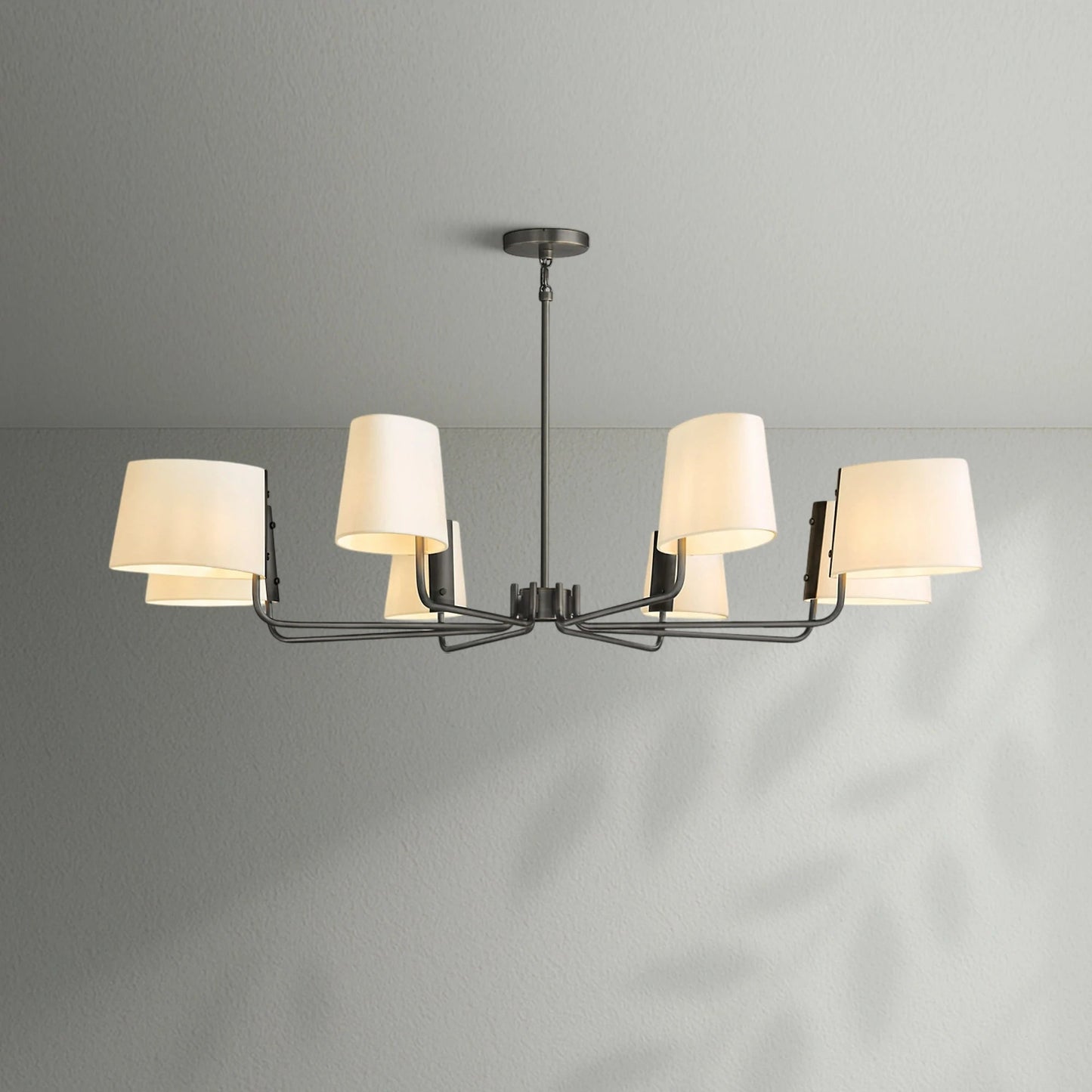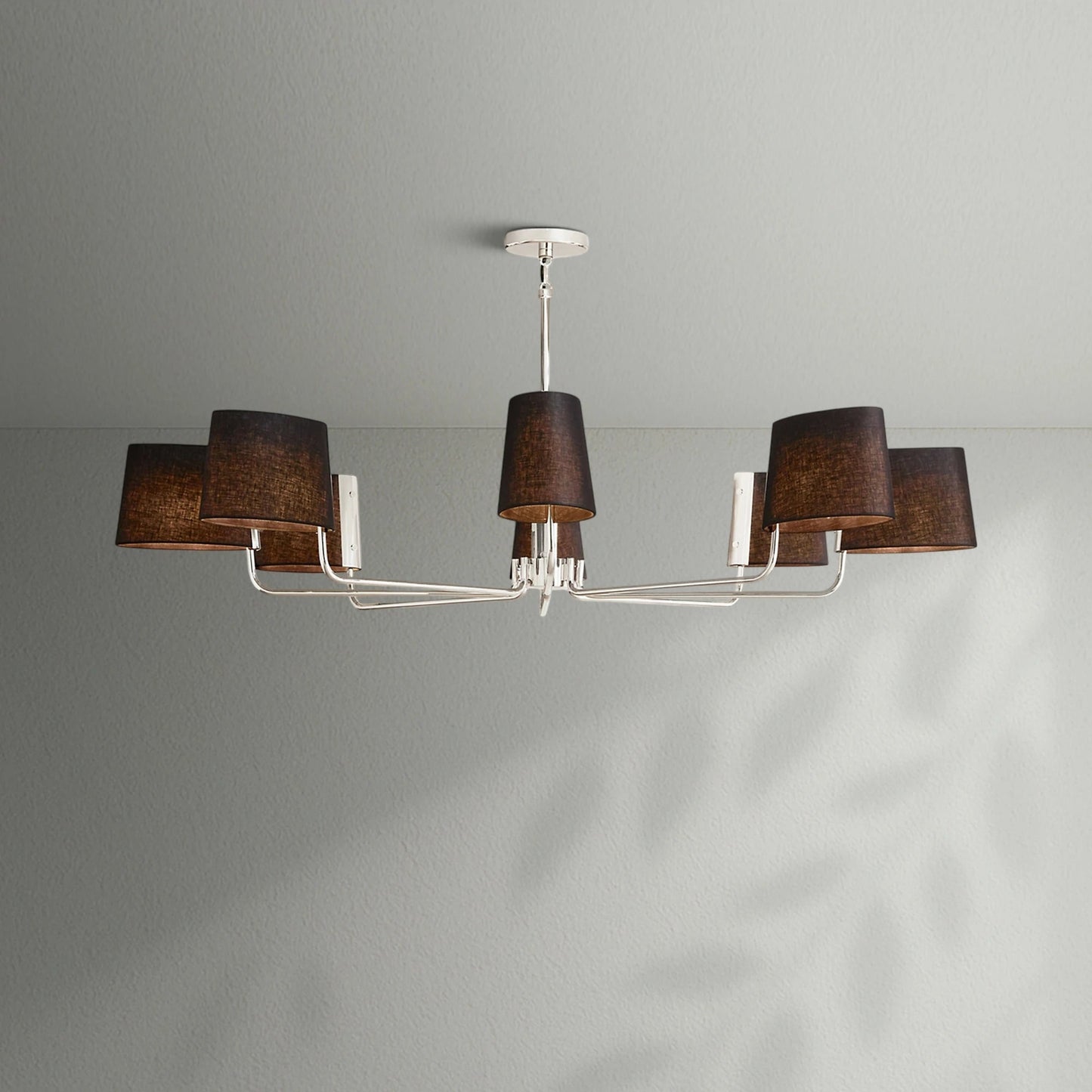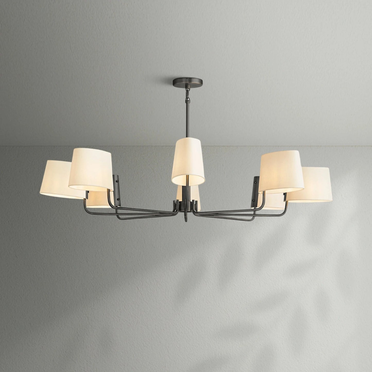 Designer looked to French designs of the 1940s and 50s for this lyrical collection, a minimalist meditation on form and function. Slender brass rods reminiscent of line drawings bend upward to showcase oval linen shades. The overall effect is one of restrained Classicism.