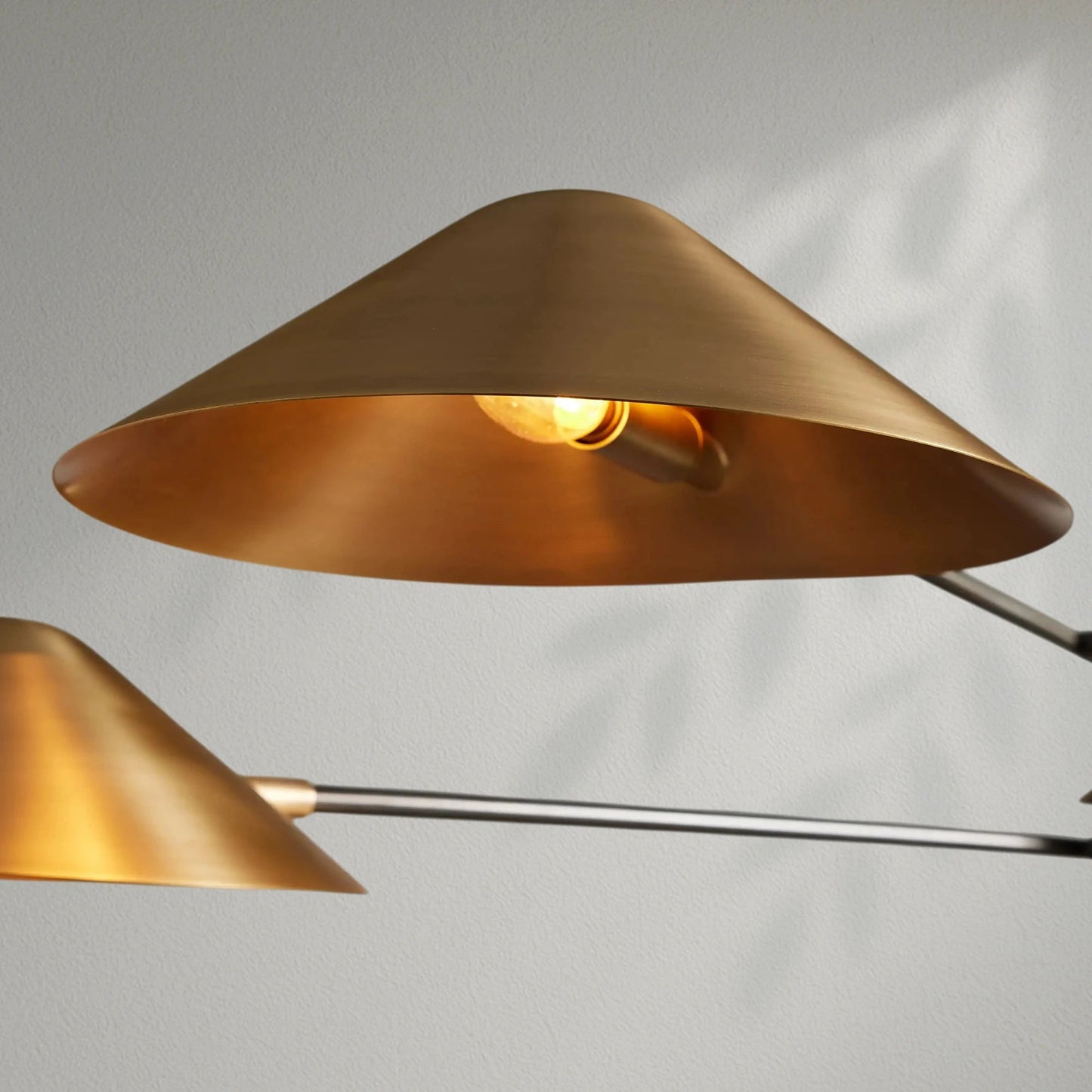 - Chandelier features pivoting arms for a linear or x-shaped silhouette and rotating shades to cascade light up or down.